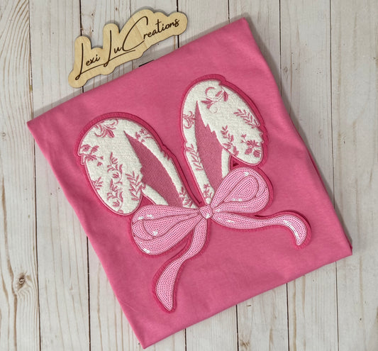 Pink Coquette Easter Bunny Ears Floral Print Chenille and Sequin Iron On Patch| Shirt Patches | Rabbit | Easter Shirt