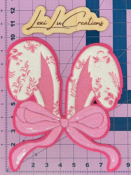 Pink Coquette Easter Bunny Ears Floral Print Chenille and Sequin Iron On Patch| Shirt Patches | Rabbit | Easter Shirt