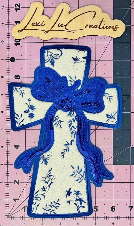 Blue Coquette Easter Cross Floral Print Chenille and Sequin Iron On Patch| Shirt Patches | Rabbit | Easter Shirt | Bunny